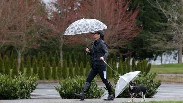 A Washington állambeli Arlingtonban sétáltatja a szitáló esőben kutyáját ez a mindenre felkészült amerikai nő, aki valószínűleg ki nem állhatja az ázottkutyaszagot. Fotó: Justin Sullivan/Getty Images